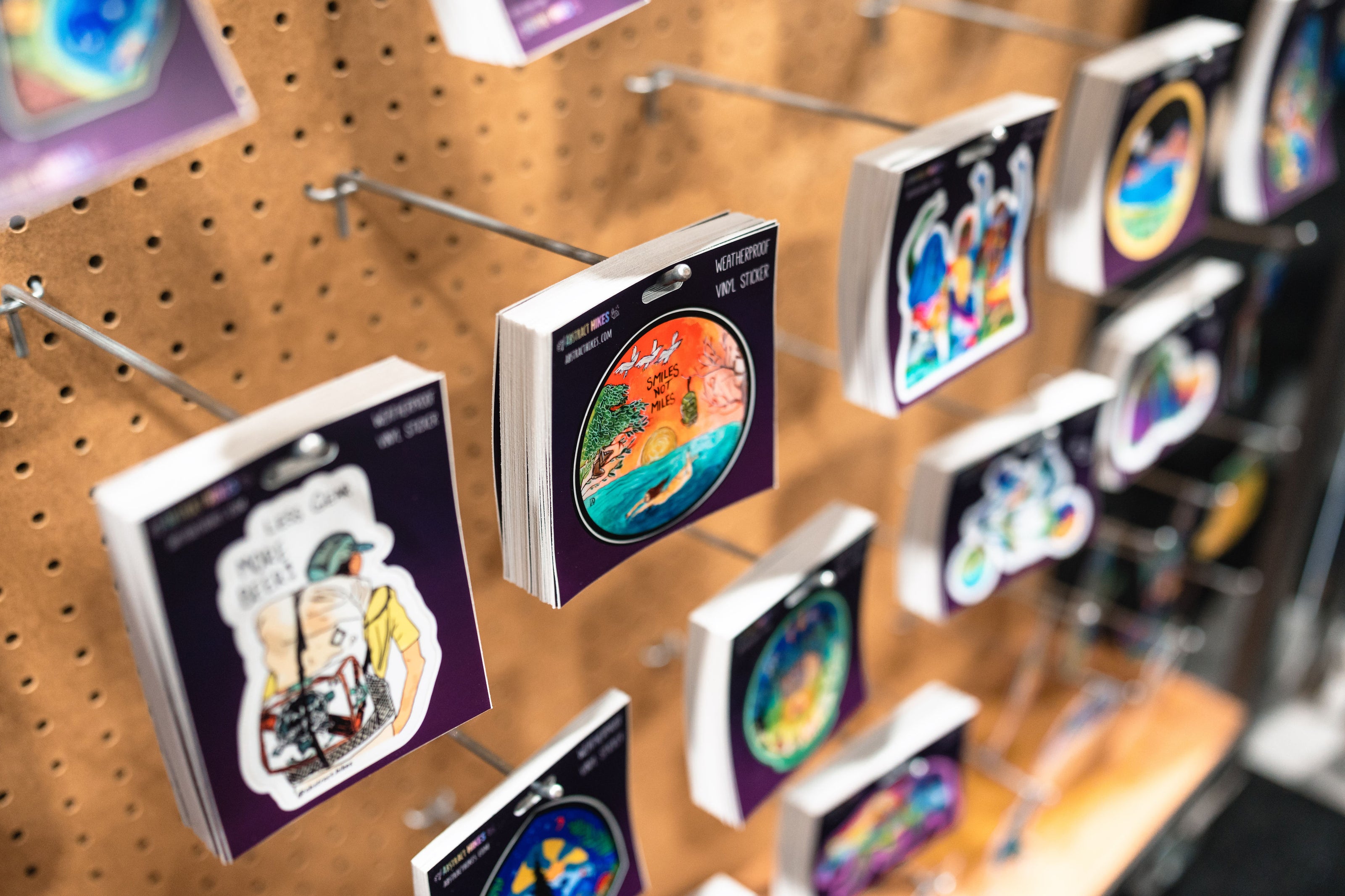 Option to order stickers without packaging or as a sticker sheet so stickers can hang from peg boards and other shop displays. Example below!