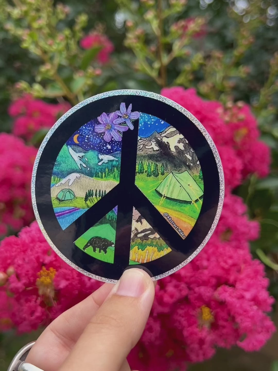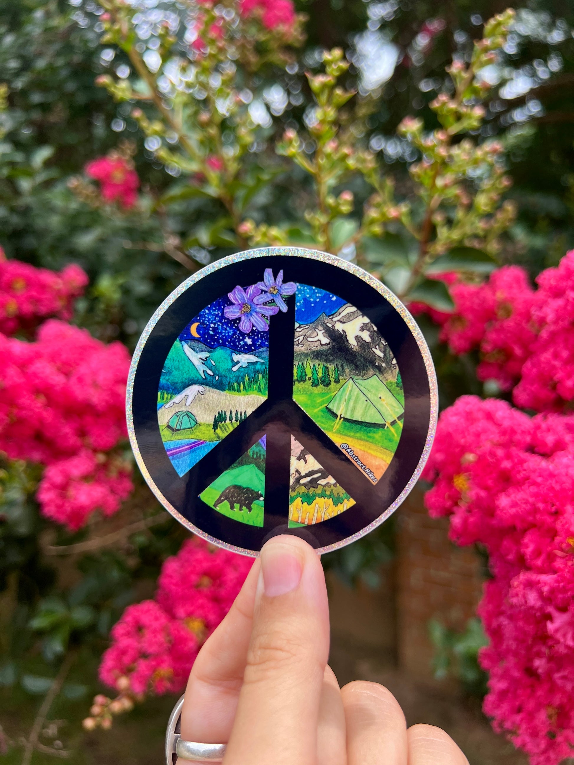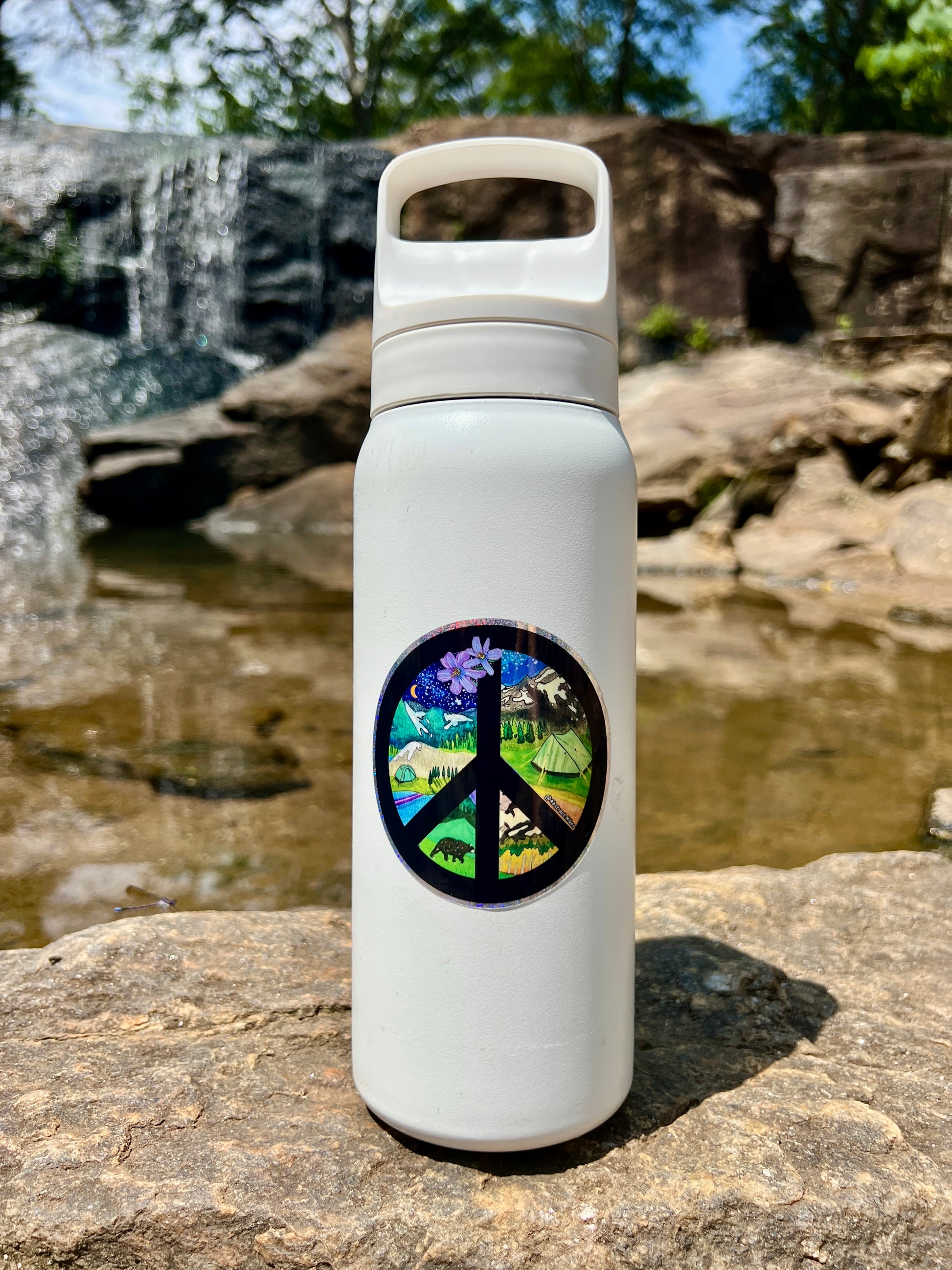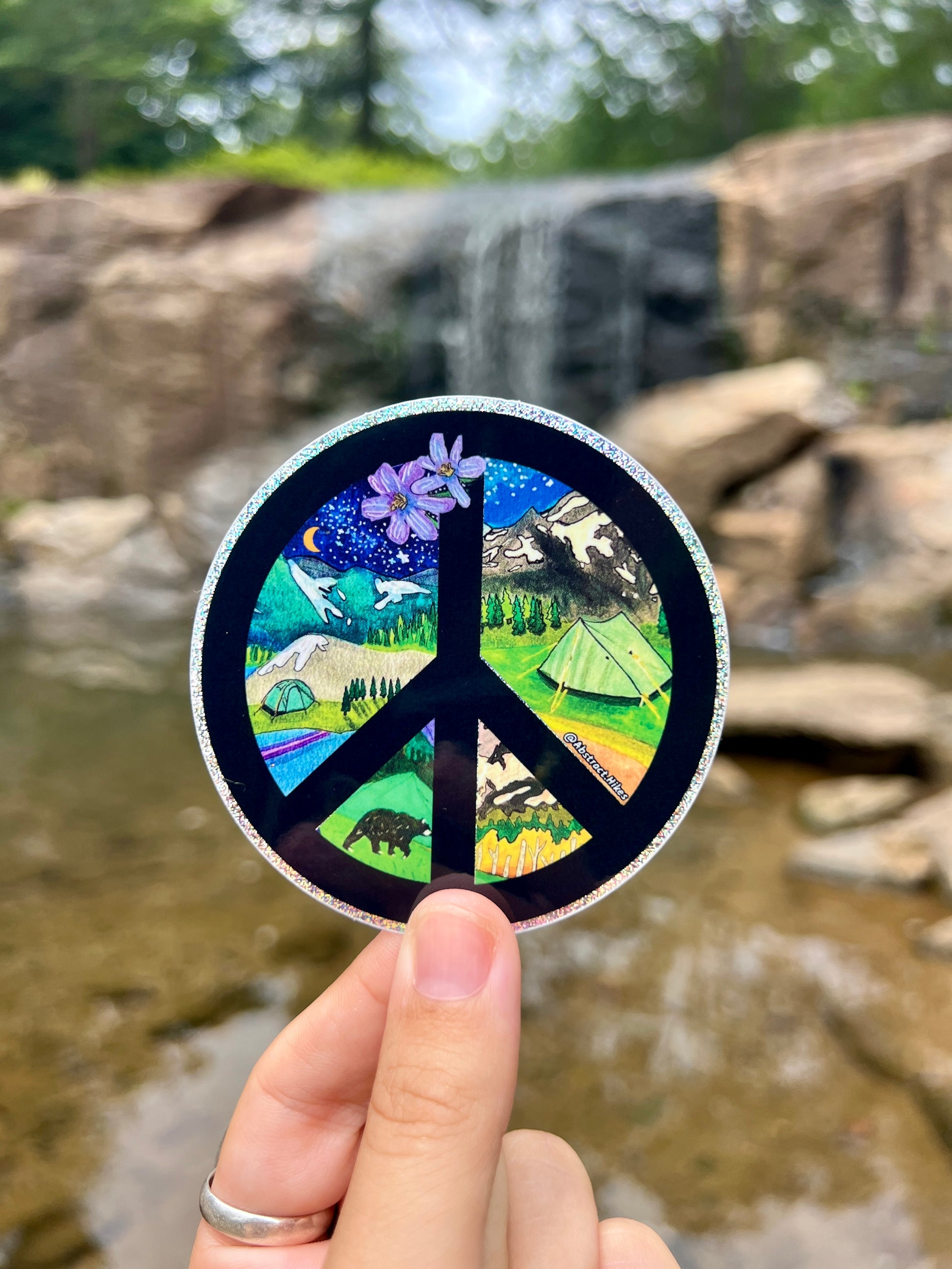 This peace sign sticker is filled with epic camping scenes deep in the wilderness. Teleport to pitching your tent under the stars at the base of jagged snowcapped mountains with this pixie dusted sticker!