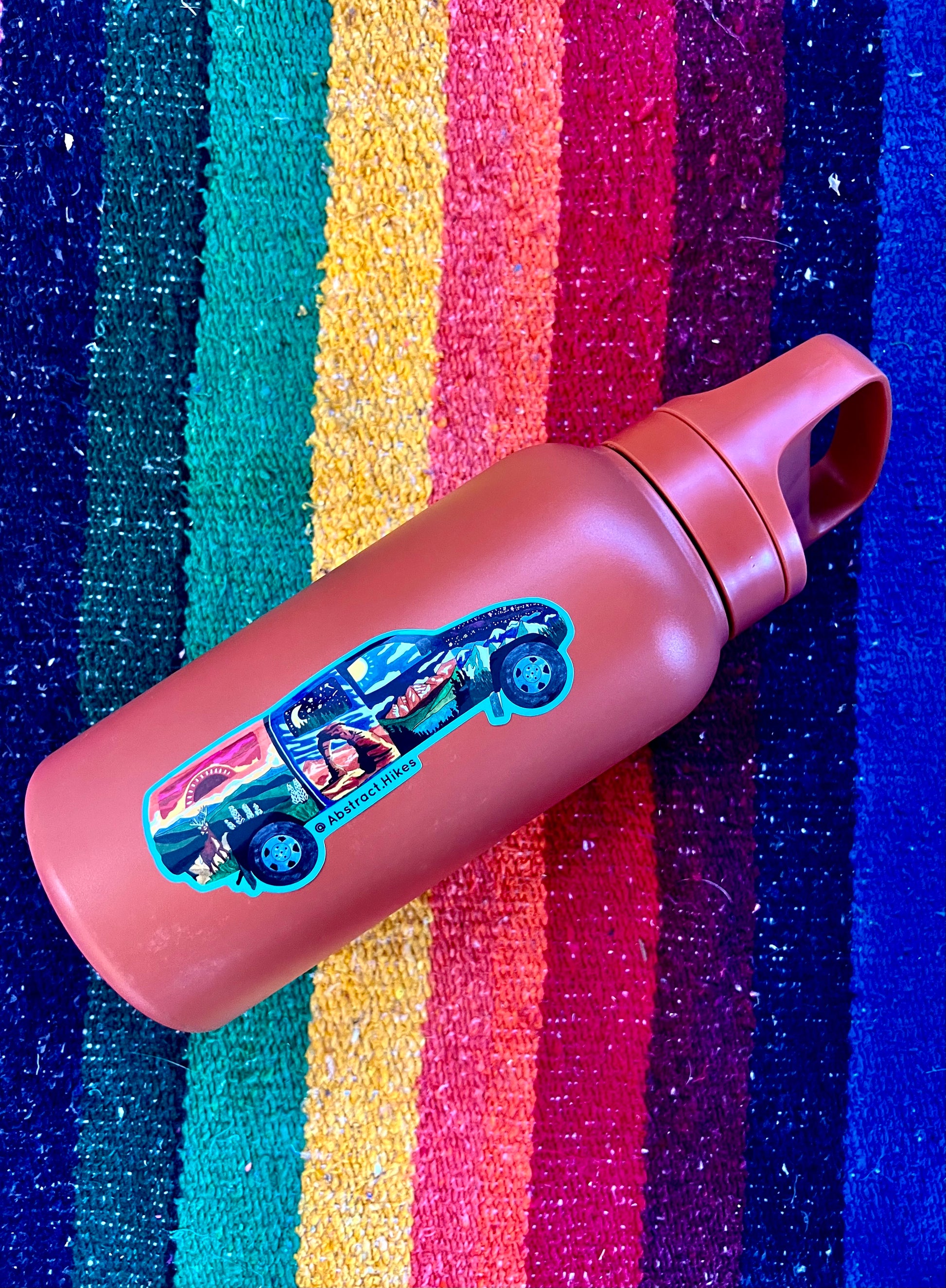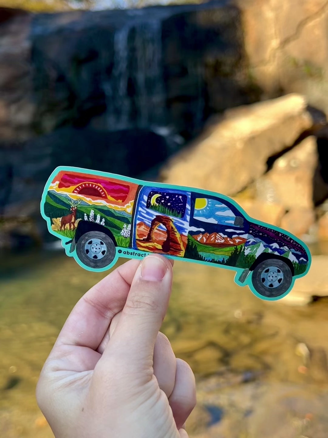 All my designs start as paintings that tell the stories of real people's adventures in nature. This particular design is based on a cross-country national park roadtrip I did a few years back in a Toyota Tacoma! Look close to see scenes from Delicate Arch (Arches National Park), Rocky Mountain National Park, Shenandoah National Park, Olympic National Park, and lots more groovy elements of mother earth!
