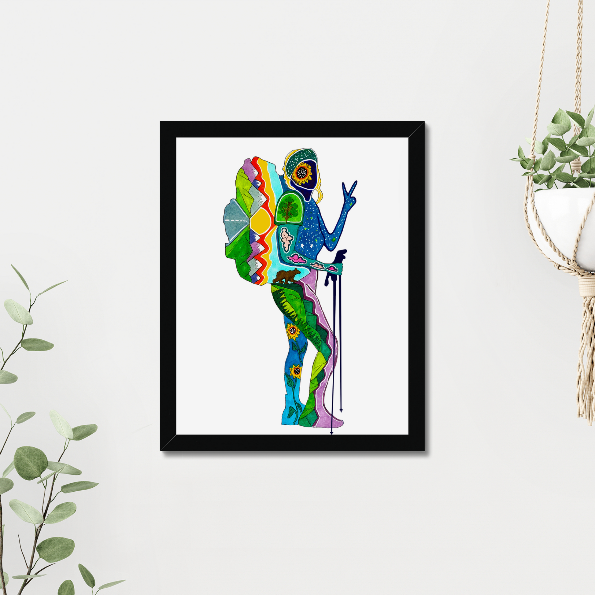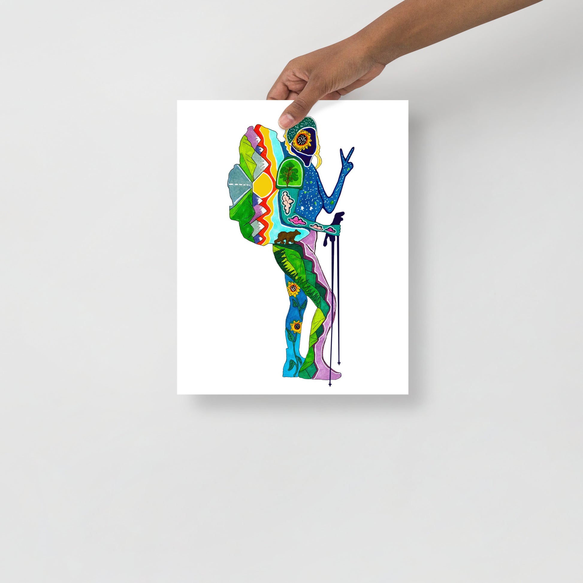 "Chica (Jen) thru-hiked the AT nobo in 2017 and this art was created from a photo of her on the trail shortly after entering the 100 Mile Wilderness in Monson, ME – so close to the end! Since the AT, Chica and her husband Sunsets have gone on to hike the Camino (Spain), Colorado Trail, Ice Age Trail, Bartram Trail and Foothills Trail. They now own and operate a hiker hostel along the AT in Franklin, NC (Chica & Sunsets Hostel) and Chica makes hiker-inspired arm candy jewelry."