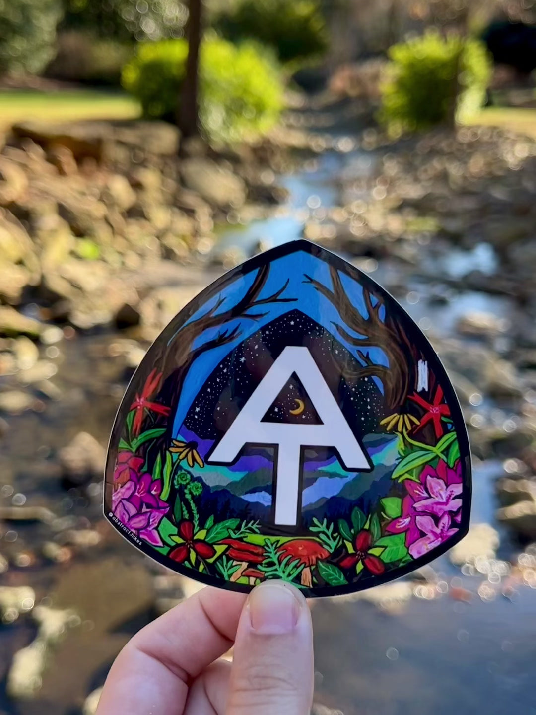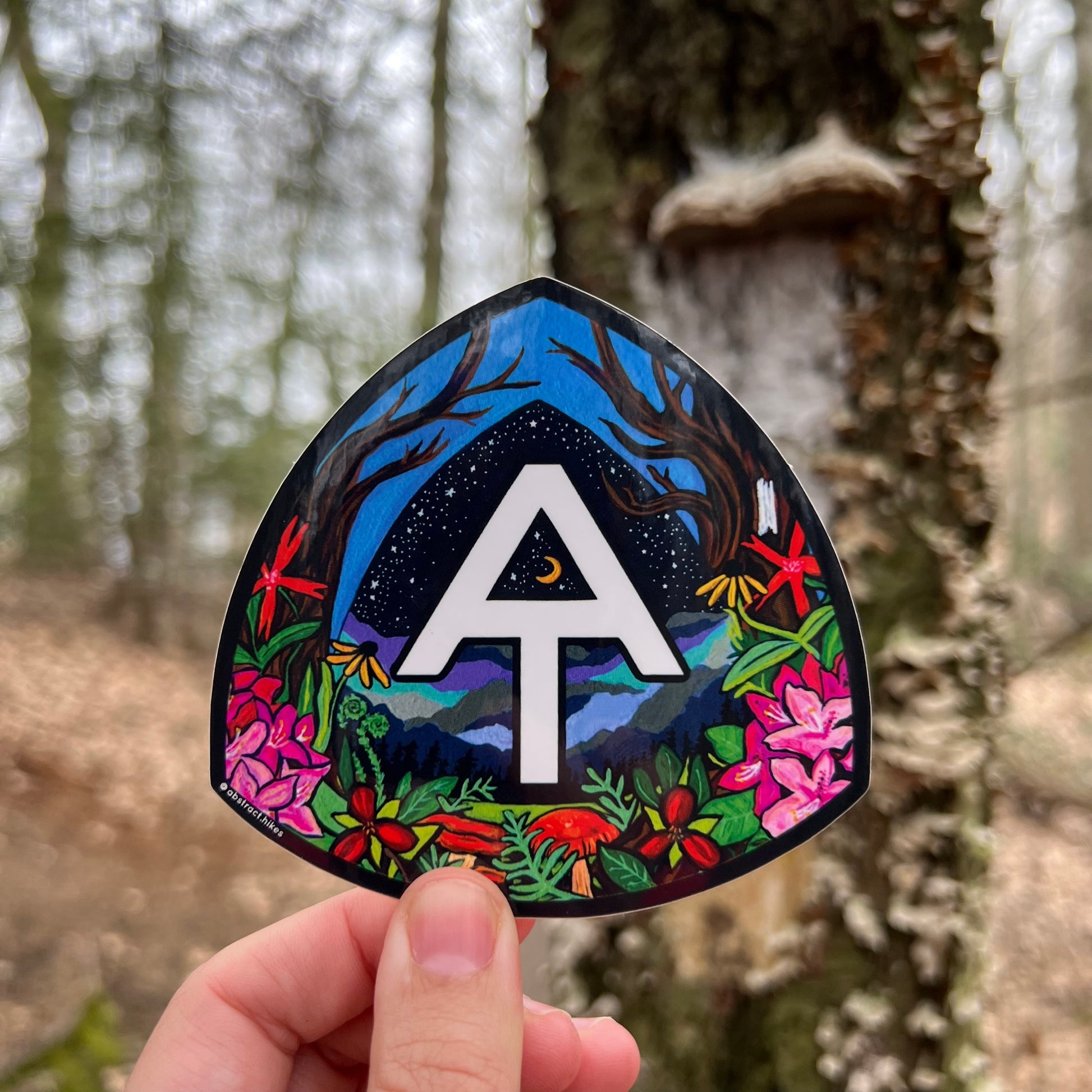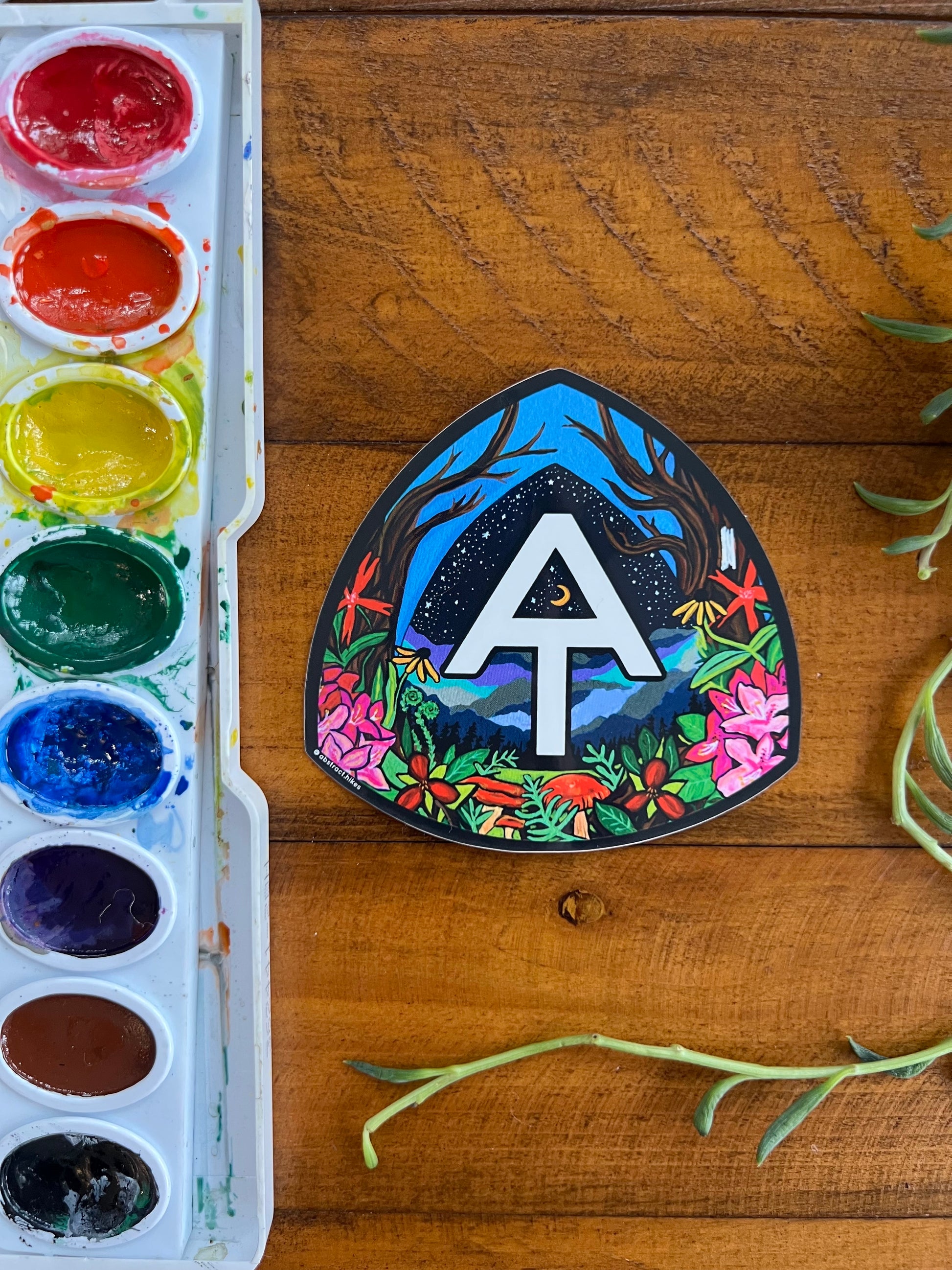 All my designs start as paintings that tell the stories of real people's adventures in nature. This particular design is my own take on the Appalachian Trail logo based on inspiration from my AT thru hike in 2017! Look close to see the Blue Ridge mountains, white blazes, wildflowers, mushrooms galore, starry skies, and lots more groovy elements of this iconic trail along the oldest mountain range in the world!
