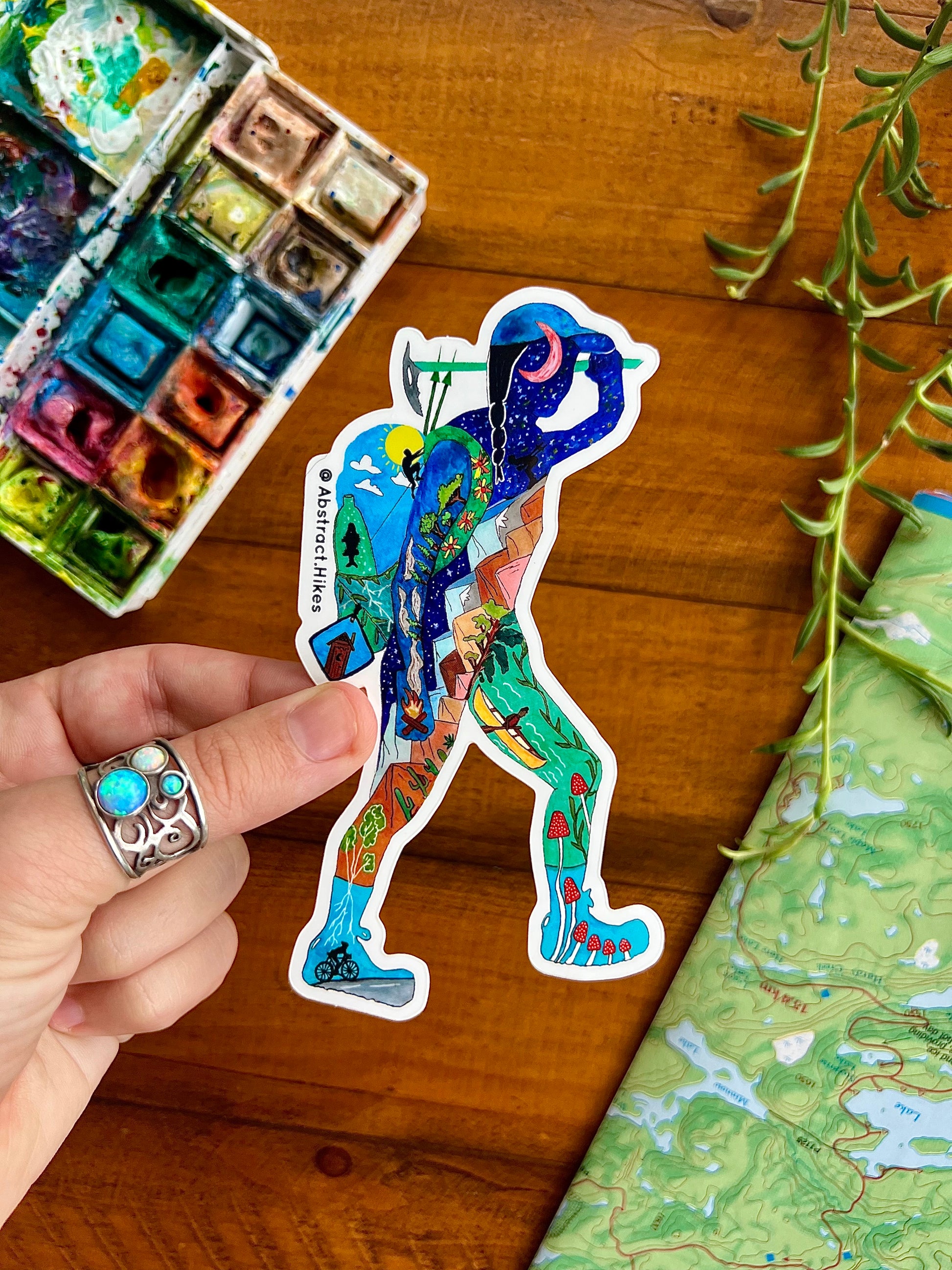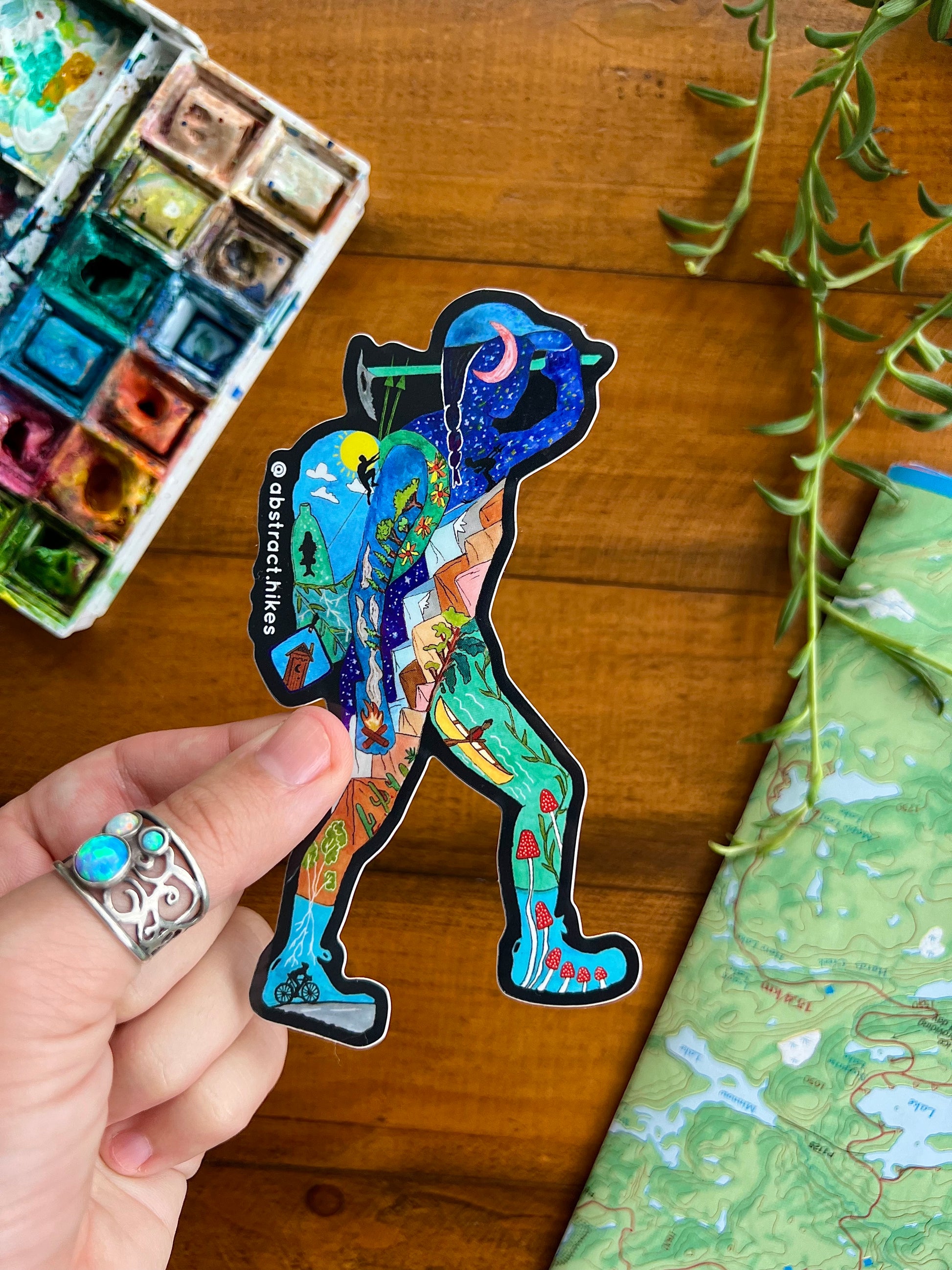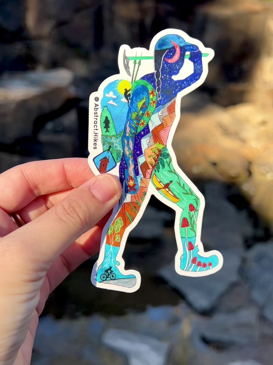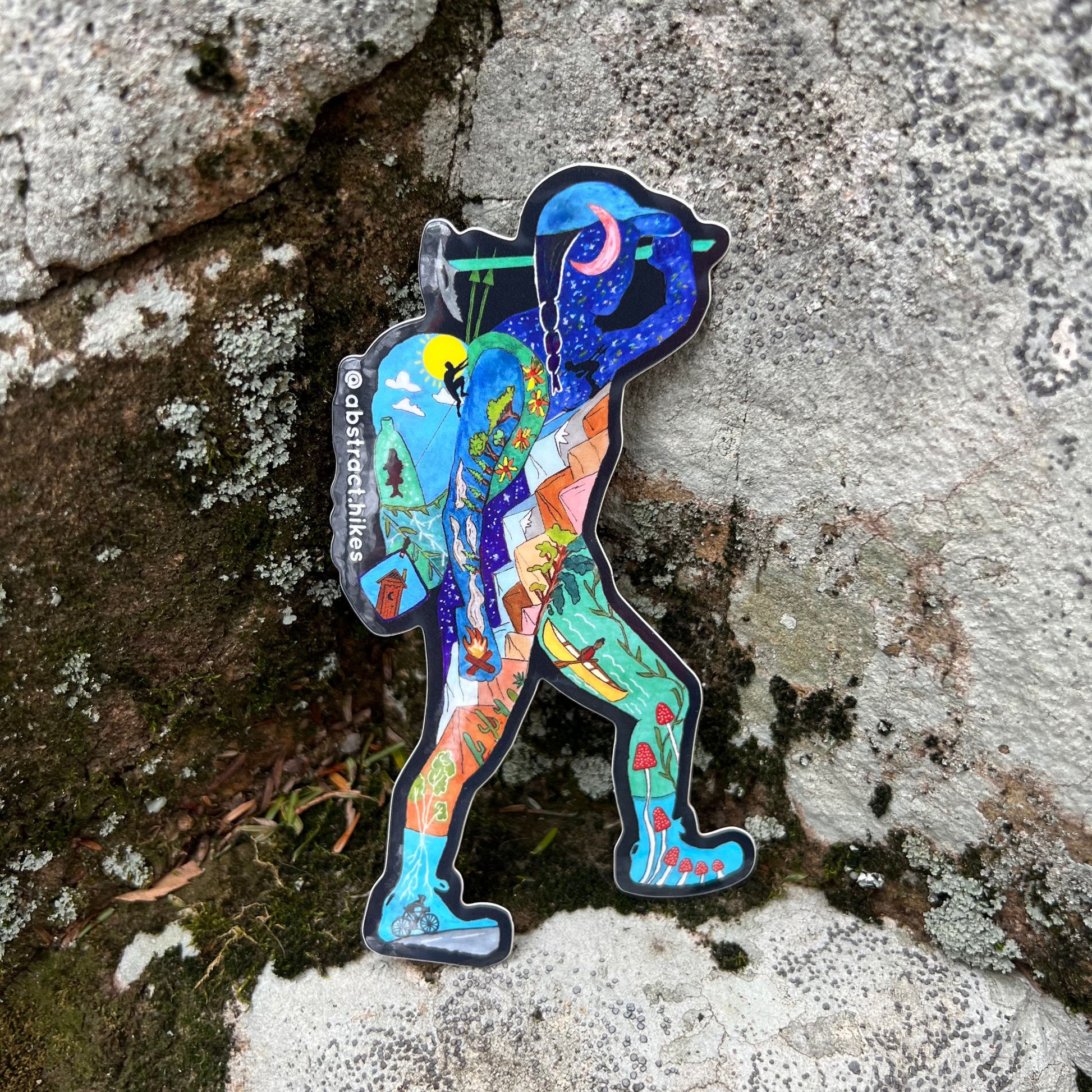 All my designs start as paintings that tell the stories of real people's adventures in nature. This particular design is based on the silhouette of a Pacific Crest Trail thru hiker and videographer named Elina Osborne who hiked this 2600+ mile trail in 2019! Whether you are a backpacker, mountaineer, rock climber, biker, or canoer - this design will definitely help inspire your next adventure!