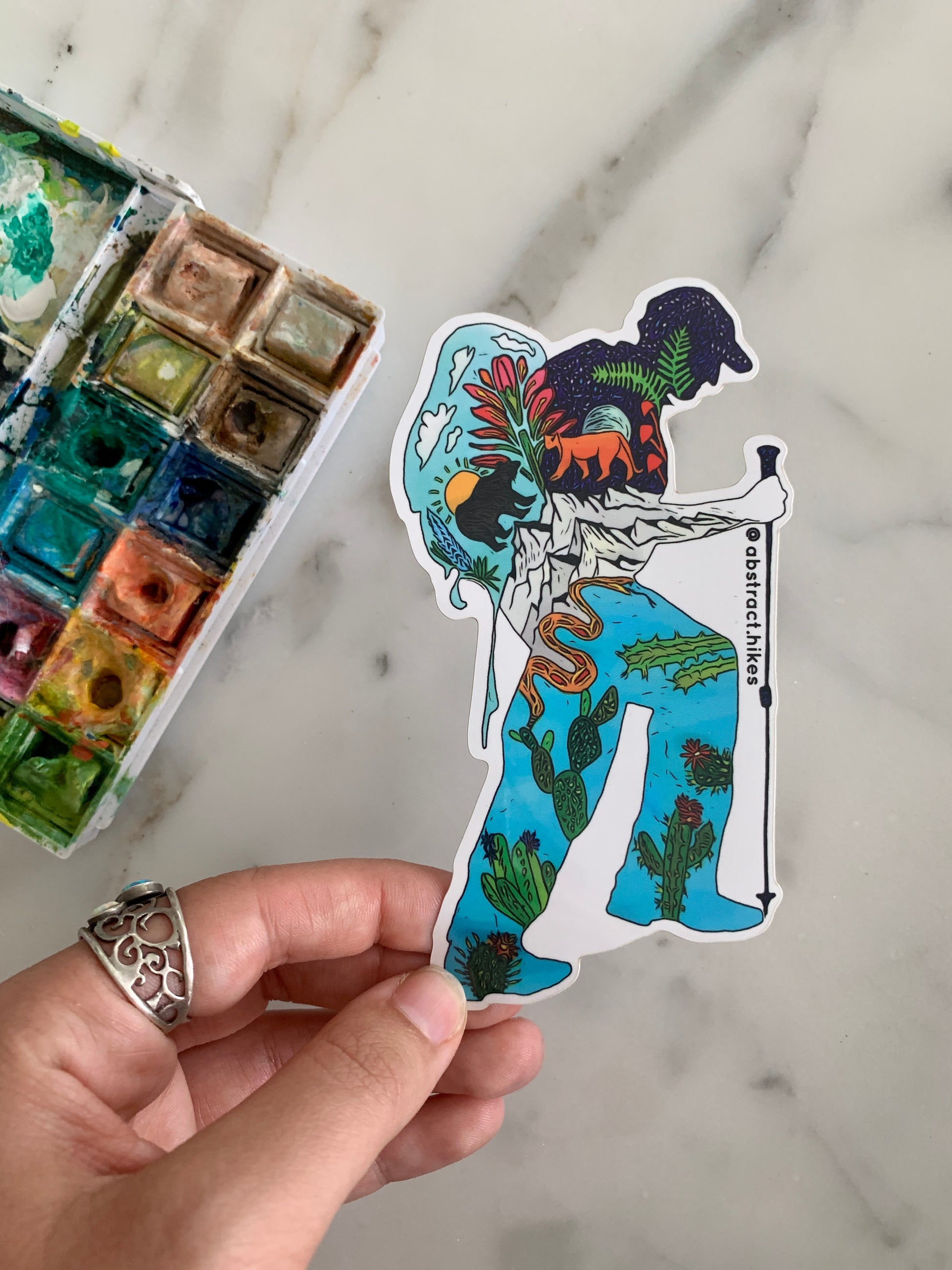All my designs start as paintings that tell the stories of real people's adventures in nature. This particular design is inspired by my 1,800 mile hike on the Pacific Crest Trail in 2019. I am so in awe of the juxtaposition of all the varied ecosystems you traverse on this beautiful trail - from the Mojave desert to the verdant jungle of the Pacific Northwest!