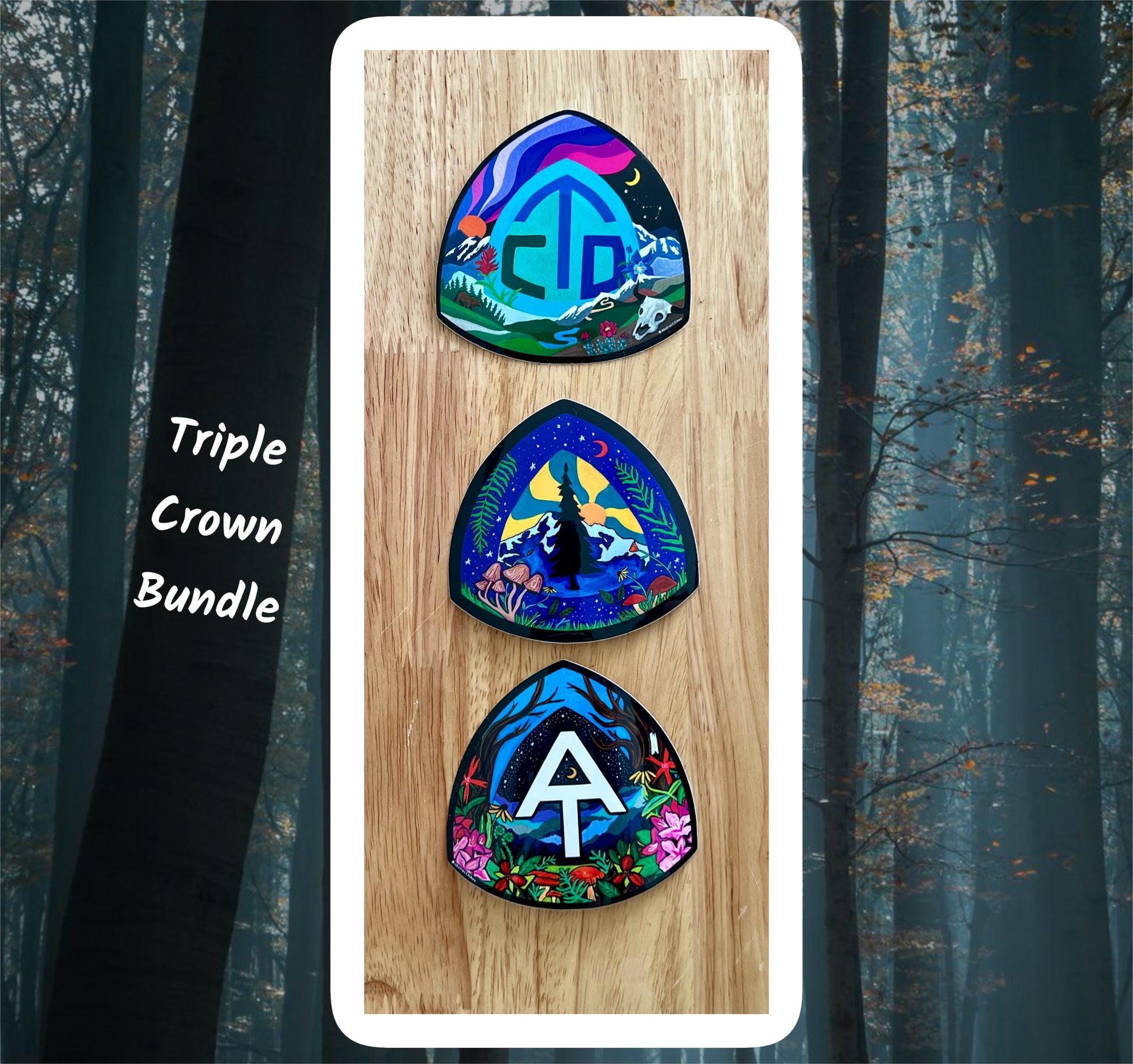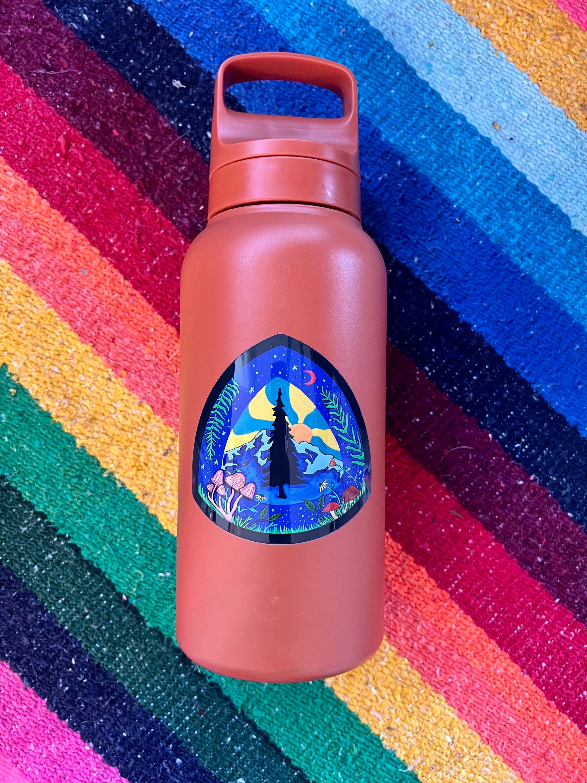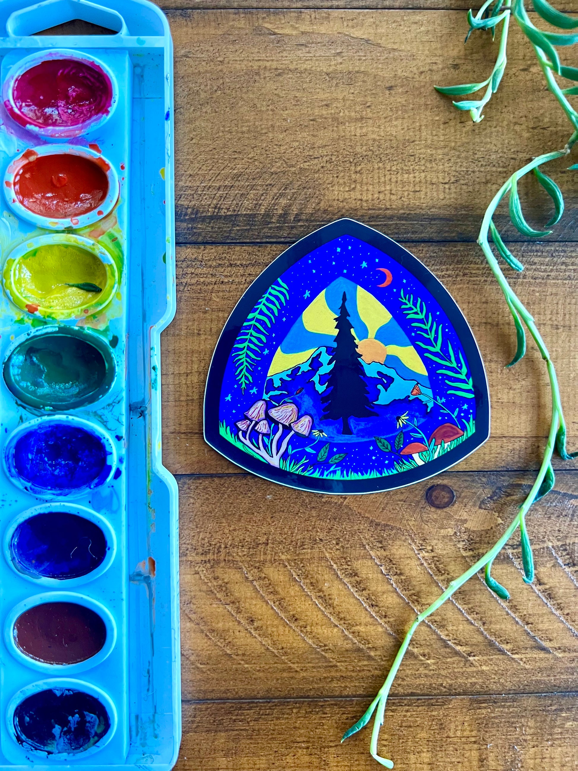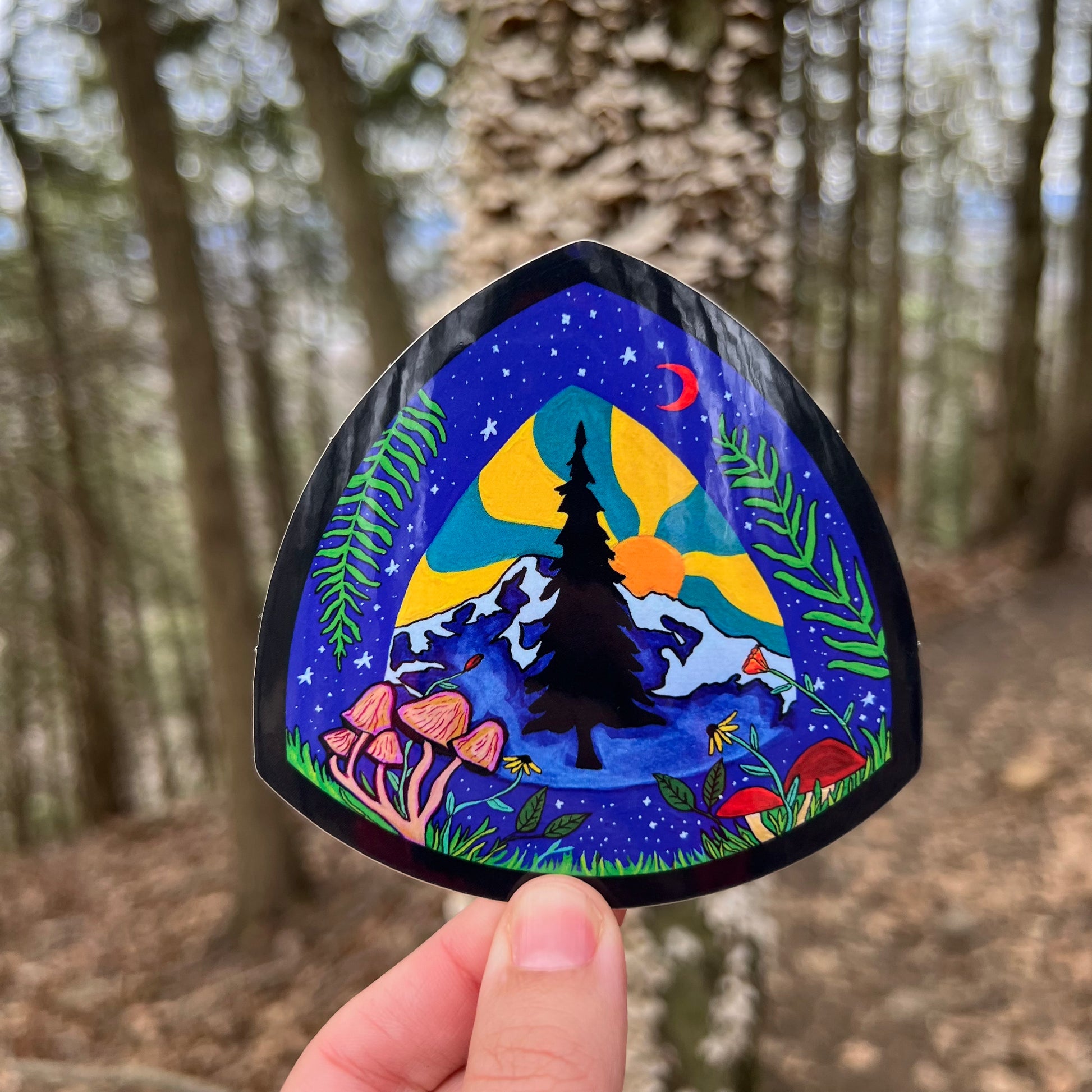 All my designs start as paintings that tell the stories of real people's adventures in nature. This particular design is my own take on the Pacific Crest Trail logo based on inspiration from my PCT hike in 2019! Look close to see Mt. Rainier, mushrooms galore, wildflowers, ferns, starry skies, and lots more groovy elements of this iconic trail!