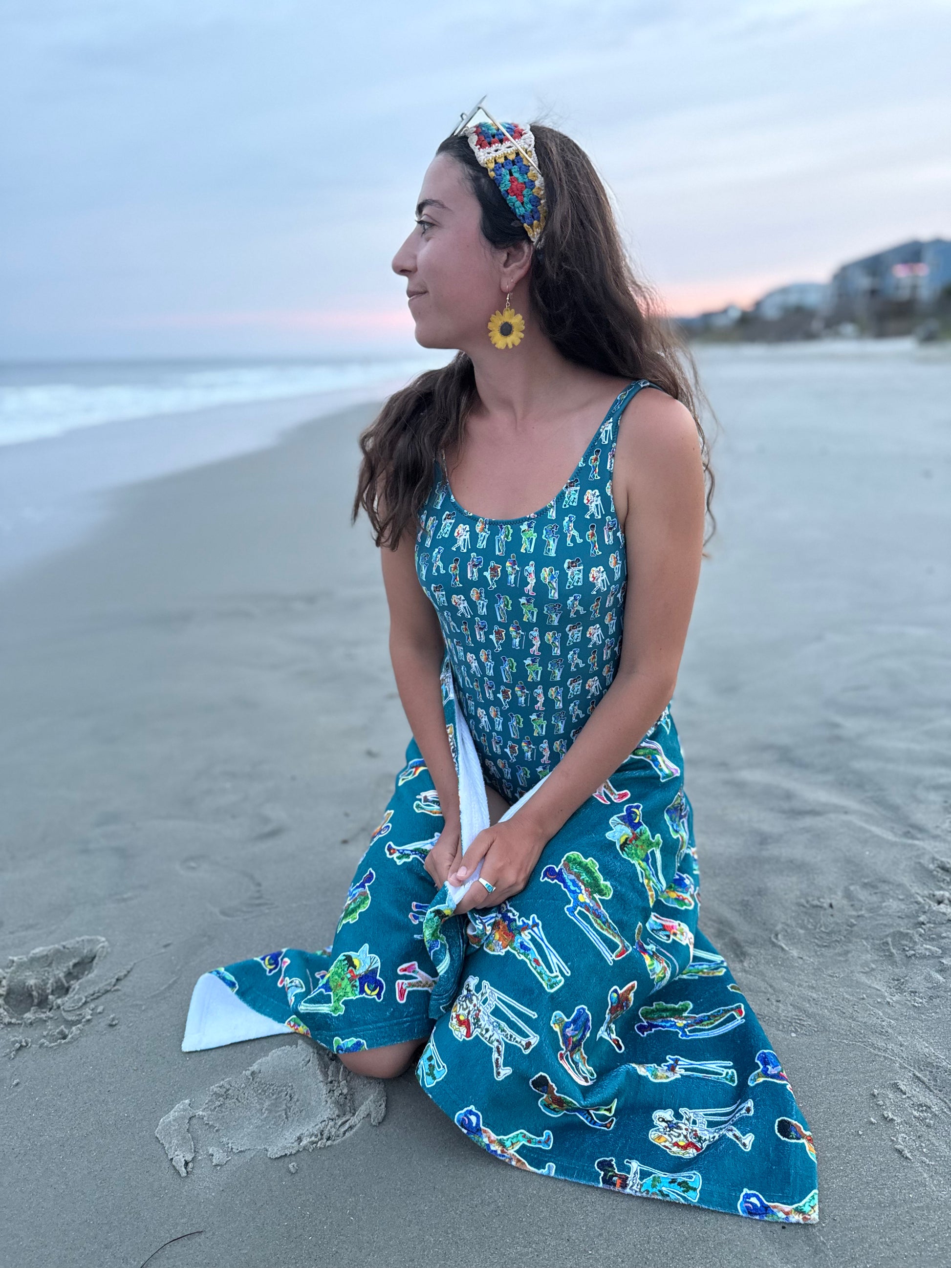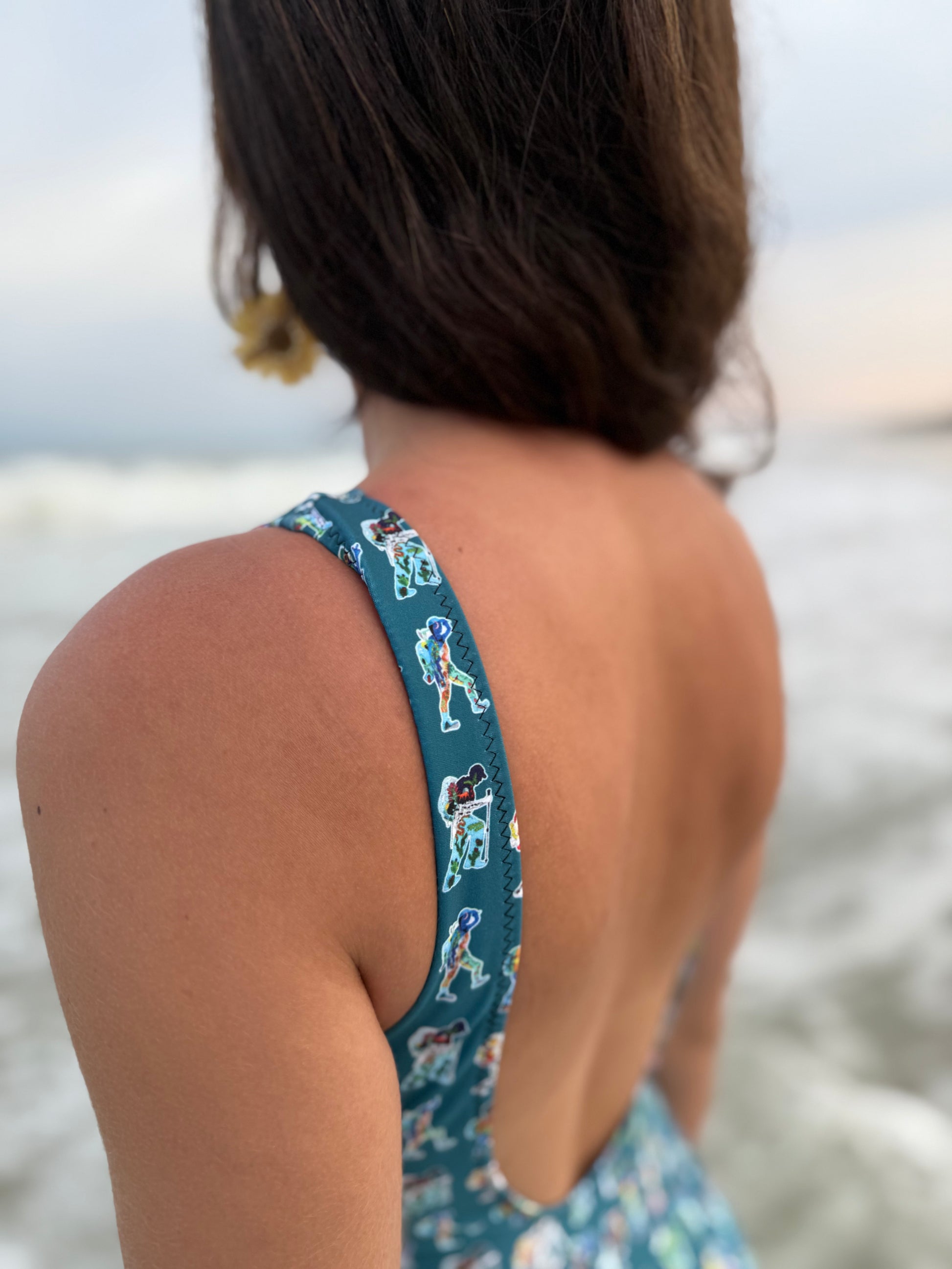 This one-piece swimsuit features all 13 of my hand-painted backpackers!